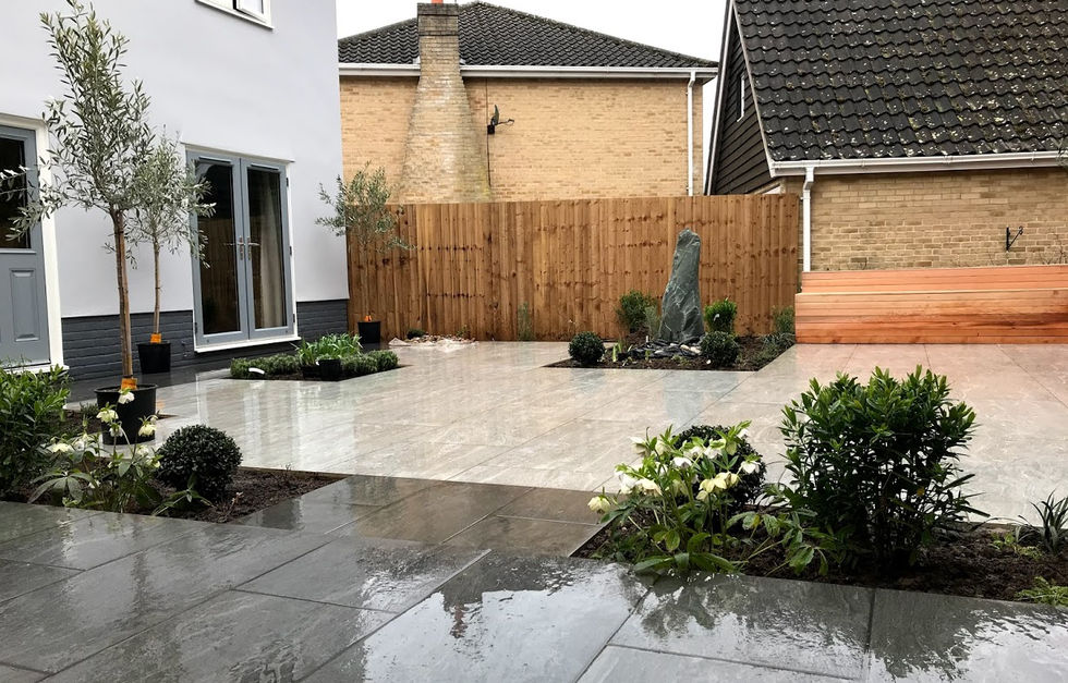 A chic courtyard design paved in two beautiful contrasting tones of grey porcelain, enhanced by a bespoke water feature that creates a central feature, enhanced by the soothing sound of water to the garden.